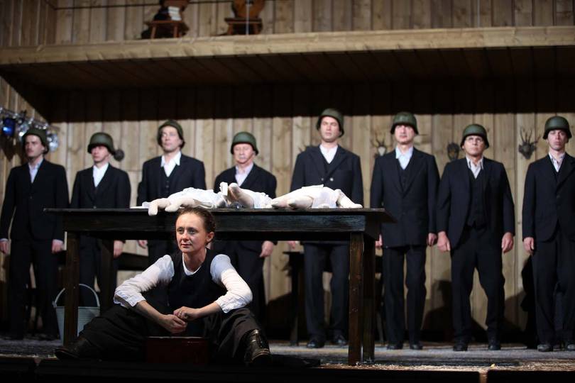 Wien, 20. Juni 2013. Der eiserne Vorhang ist schon einen Spaltbreit hinaufgezogen: Stuhlbeine zeichnen sich dahinter ab, lose verteilt in einem mit Holz ausgekleideten Raum, einer auf die große Bühne hochskalierten Bauernstube. Gleich darauf 24 schwarz gekleidete Menschenbeine dazu. Eine Hand hebt langsam einen Brief vom Boden auf, im gleichen Tempo hebt sich nun auch feierlich der Eiserne. Die Hand gehört Franziska Jägerstätter, der Brief enthält die Bekanntgabe des an ihrem Mann am 9. August 1943 in Brandenburg vollstreckten Todesurteils. Sie nimmt sich Zeit beim Verlesen, rundherum Totenstille. Dann die Schwiegermutter: "Du hast ihn umbracht." Die übrigen, ein Chor (fast) aus Männern, skandieren es ihr nach.